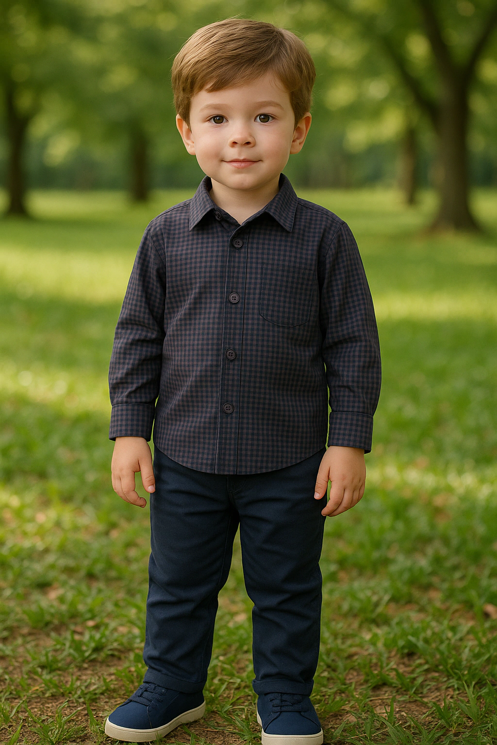 Deixe o visual dos pequenos ainda mais charmoso com esta camisa infantil xadrez de manga longa! Confeccionada em tecido leve e confortável 100% algodão, ela combina estilo e praticidade para diversas ocasiões. O modelo possui estampa xadrez discreta nas cores azul marinho e verde, botões frontais e nas mangas, além de opção para prender a manga dobrada, garantindo versatilidade no uso.
