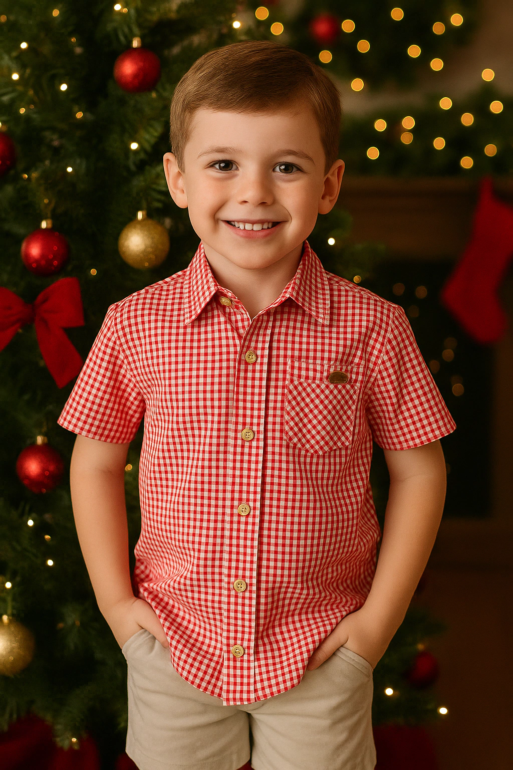 O modelo traz o tradicional xadrez vichy em vermelho e branco, com abertura frontal por botões amadeirados, bolsinho aplicado e etiqueta de couro que reforça o toque sofisticado e artesanal característico da Bárbara Kids.