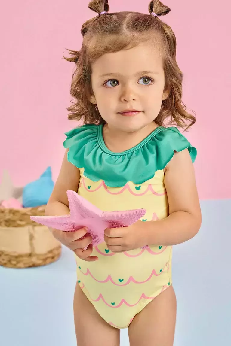 O maiô em malha UV dry com proteção UV 50+ prepara a sua pequena para desfrutar o verão com muito estilo e proteção. Disponível em duas cores super estilosas - rosa e amarelo - este maiô oferece um toque suave, secagem rápida e muito conforto, ideais para seus dias de sol na praia ou piscina. A sublimação divertida adiciona um charme especial à peça.