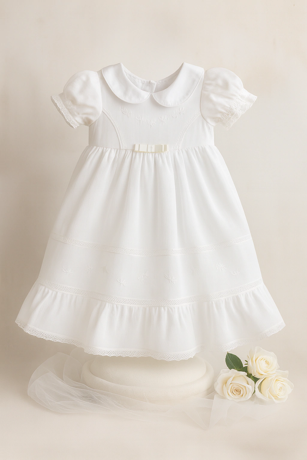 Um modelo encantador e atemporal, ideal para o momento especial do batizado. Confeccionado em tecido leve e macio 100% algodão, o vestido traz toda a delicadeza e pureza que a ocasião pede.