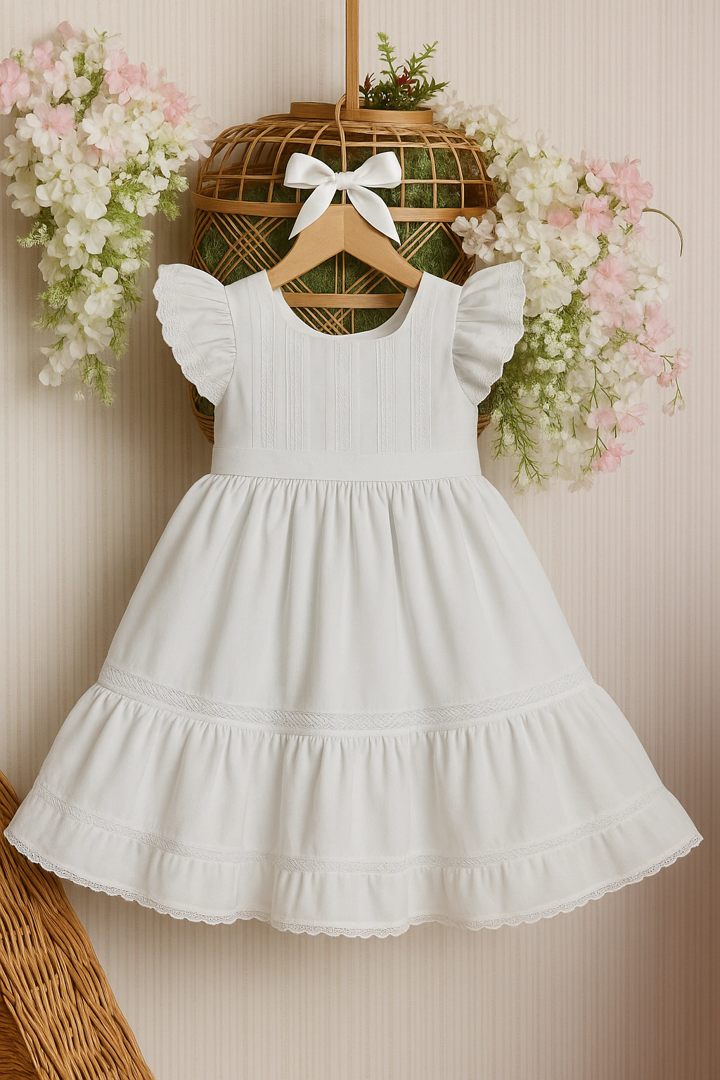 O vestido é confeccionado em tecido leve e macio, com delicados detalhes de renda no peito, nas mangas e na barra, que trazem um toque artesanal e sofisticado.